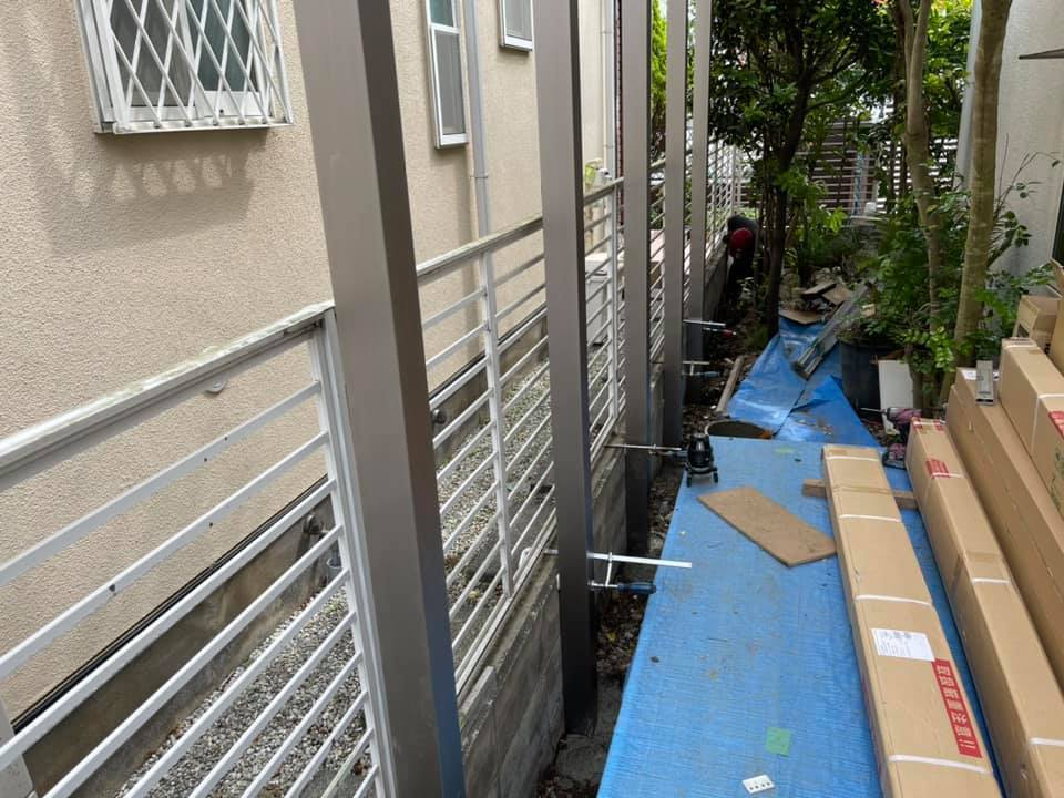 今回のリフォームのメインの板貼りフェンスはリビング前が貼り終わり、新たに白い木目調の板材を使用したことにより室内まで明るくなっているお客様より喜びの声を頂いています!!