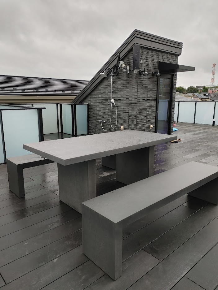 屋上なので、小さなお子様が動かすことが出来ない重量感のあるテーブルとベンチを選ばれました。