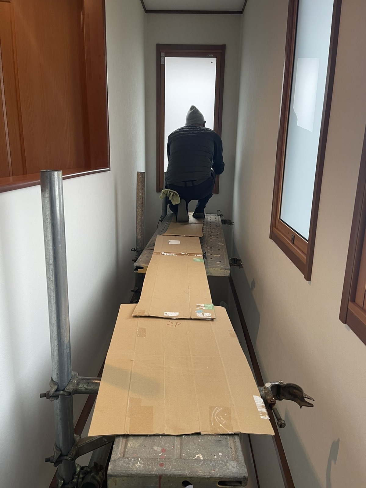 高い位置にある窓は、足場を設置して対応。西日の暑さが気になっていました。