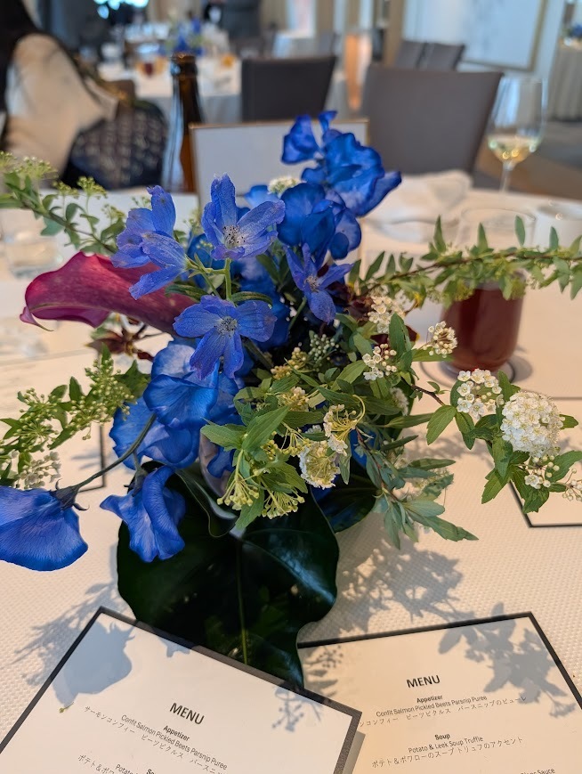 個人的に印象に残ったのは、テーブルに飾られていたアレンジで、ブルーのスイートピーです。はじめて見る色だったことも有り・・同色で他の花と混ぜて使用しているところに興味をそそられました。青系は他と組み合わせるのが難しいですね。