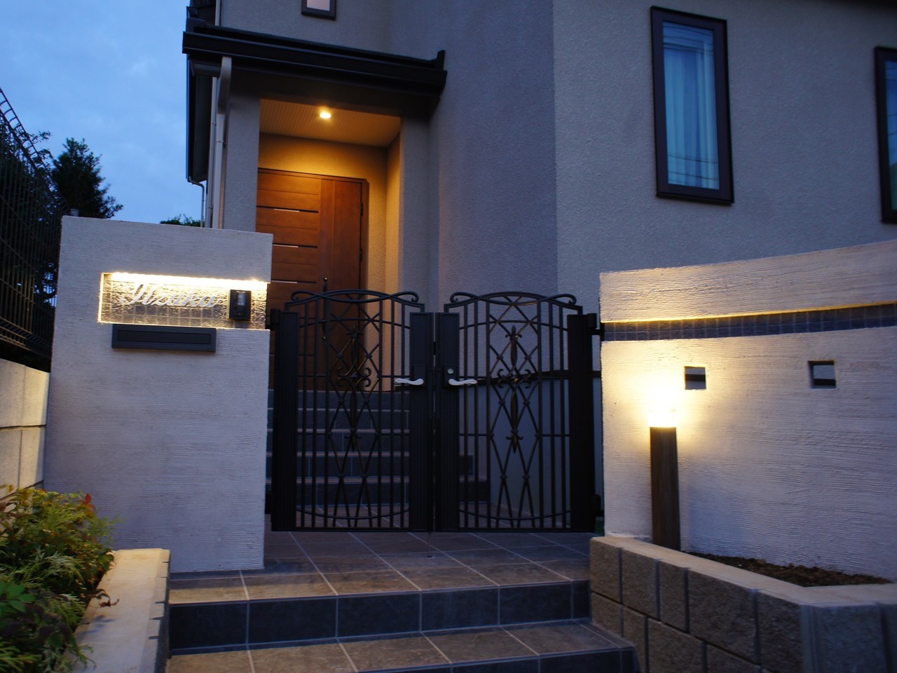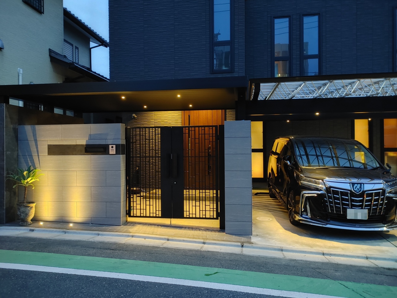 カーポート&跳ね上げゲート!門周りとのバランスを崩しがちなデザインにフレームをかけ門周りをグレードUPさせました。夜も◎